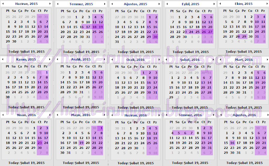 Kullanmak isteyenler kullanabilsin diyede paylaşmaya karar verdim. Renklendirilmiş kısımlar tatil günlerini, rakamların yarısı renkli yarısı renksiz olan yerler yarım gün tatil olduğunu, üst üste binmiş renkli kısımlar ise resmi tatillerin hafta sonu tatilleri ile kesiştiğini belirtiyor.